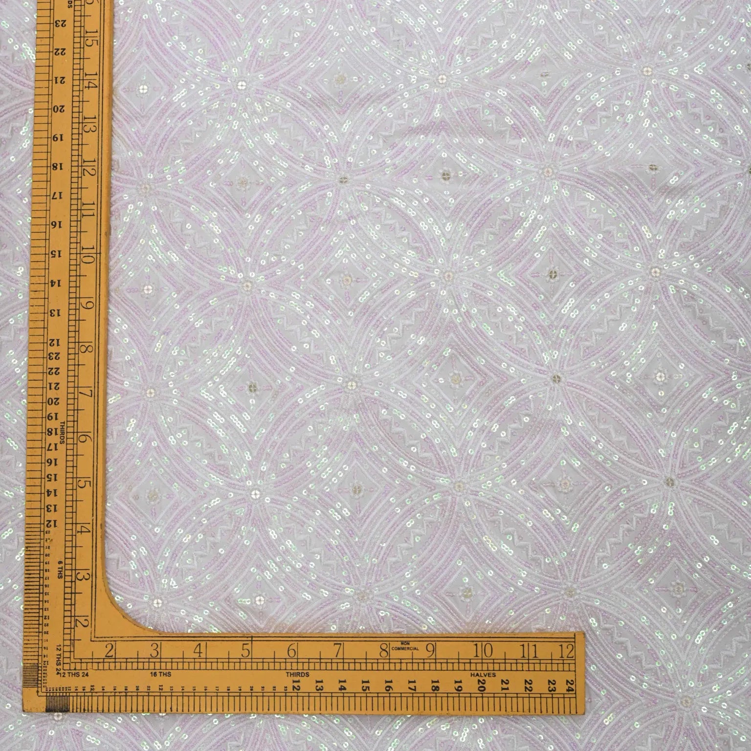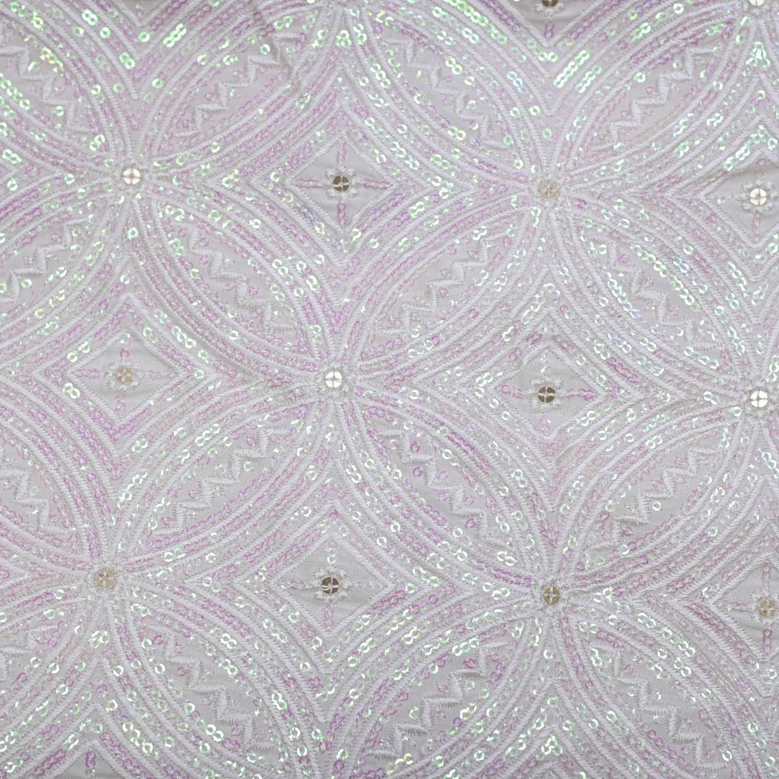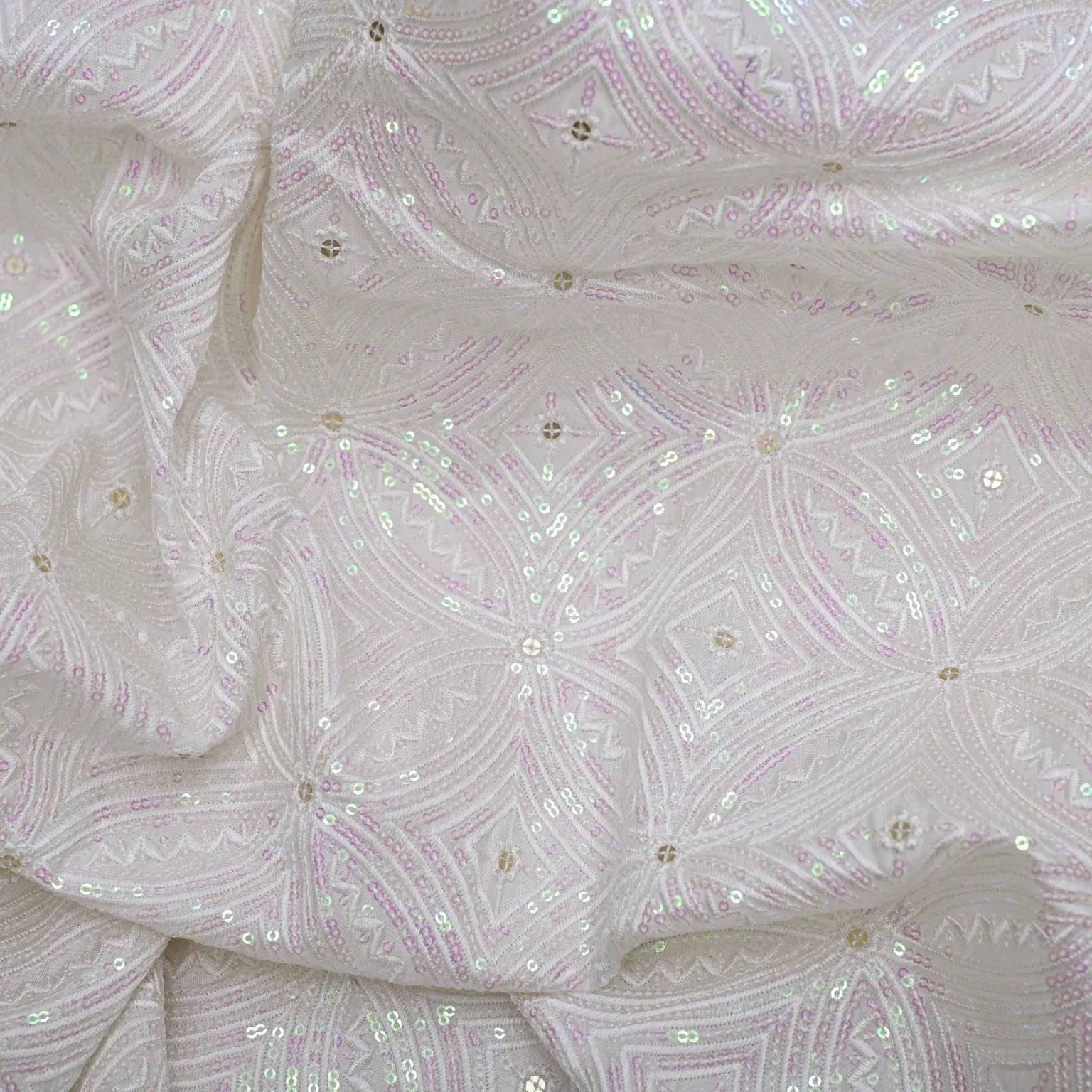 Bring a hint of elegance to your wardrobe with this exquisite Thread Work Embroidery on white dyeable Russian silk fabric. Featuring all-over Pani sequins Tikki work embroidery, this stunning fabric is sure to flatter any occasion. Decadent yet timeless, it will bring an elegant and luxurious air to your look!