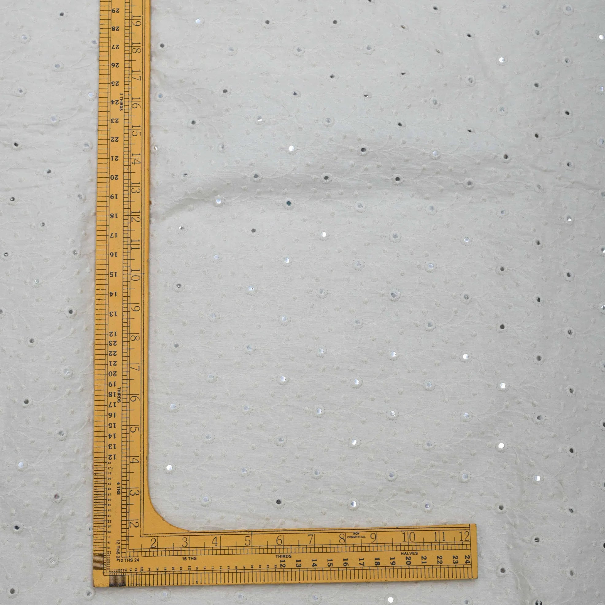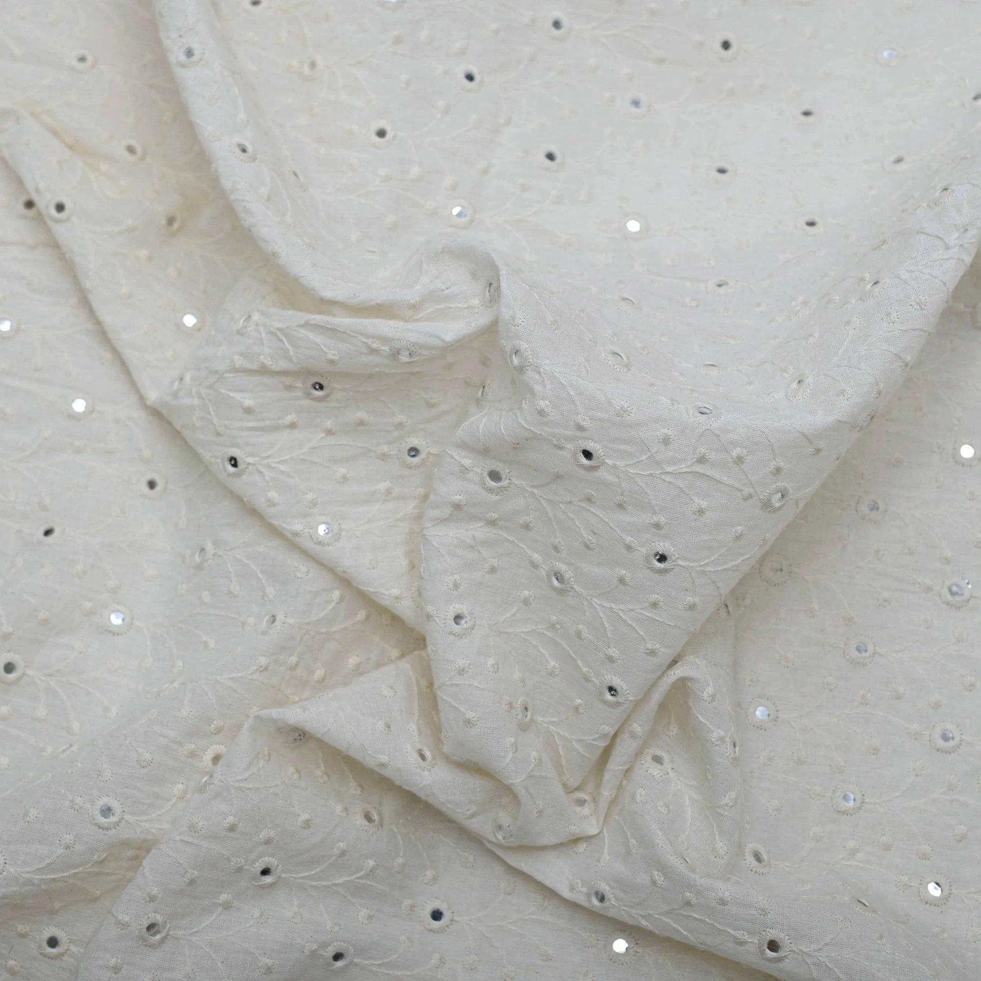 This intricate All Over Thread Mirror Work on Dyeable Grey Cotton Fabric is perfect for an array of creative projects. Whether you want to add a special touch to a garment or target a craft project, this fabric offers beautiful design detail and the freedom of custom color. The perfect canvas for your creativity!