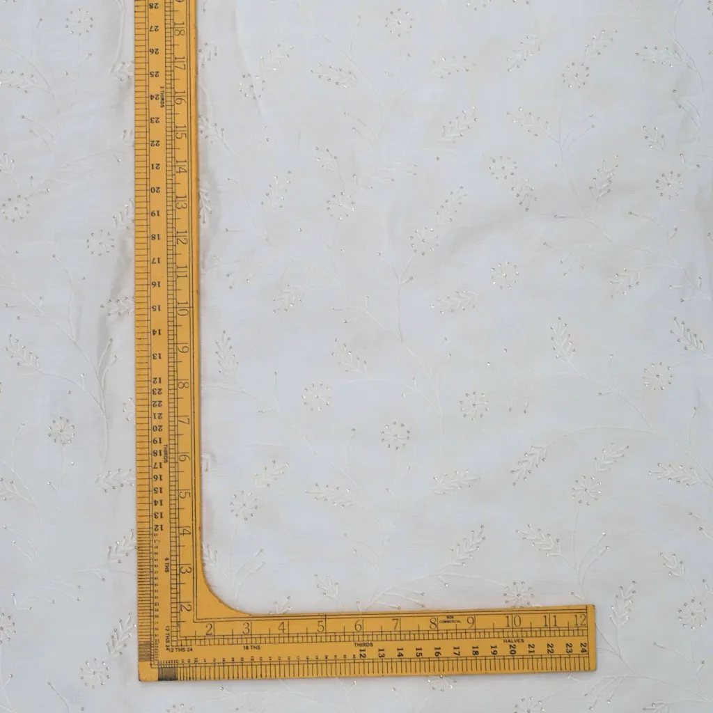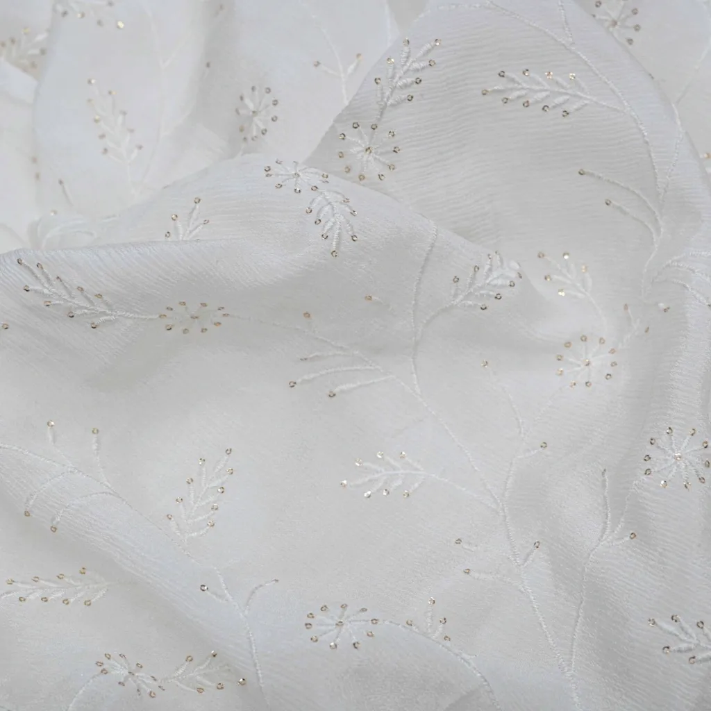 Beautify your wardrobe with this elegant Chinnon Chiffon fabric with all-over jaal embroidery! Richly detailed with zari mirror work, it has a luxuriously soft feel and is easily dyeable for creating diverse looks. Create stunning garments with this exquisite fabric!