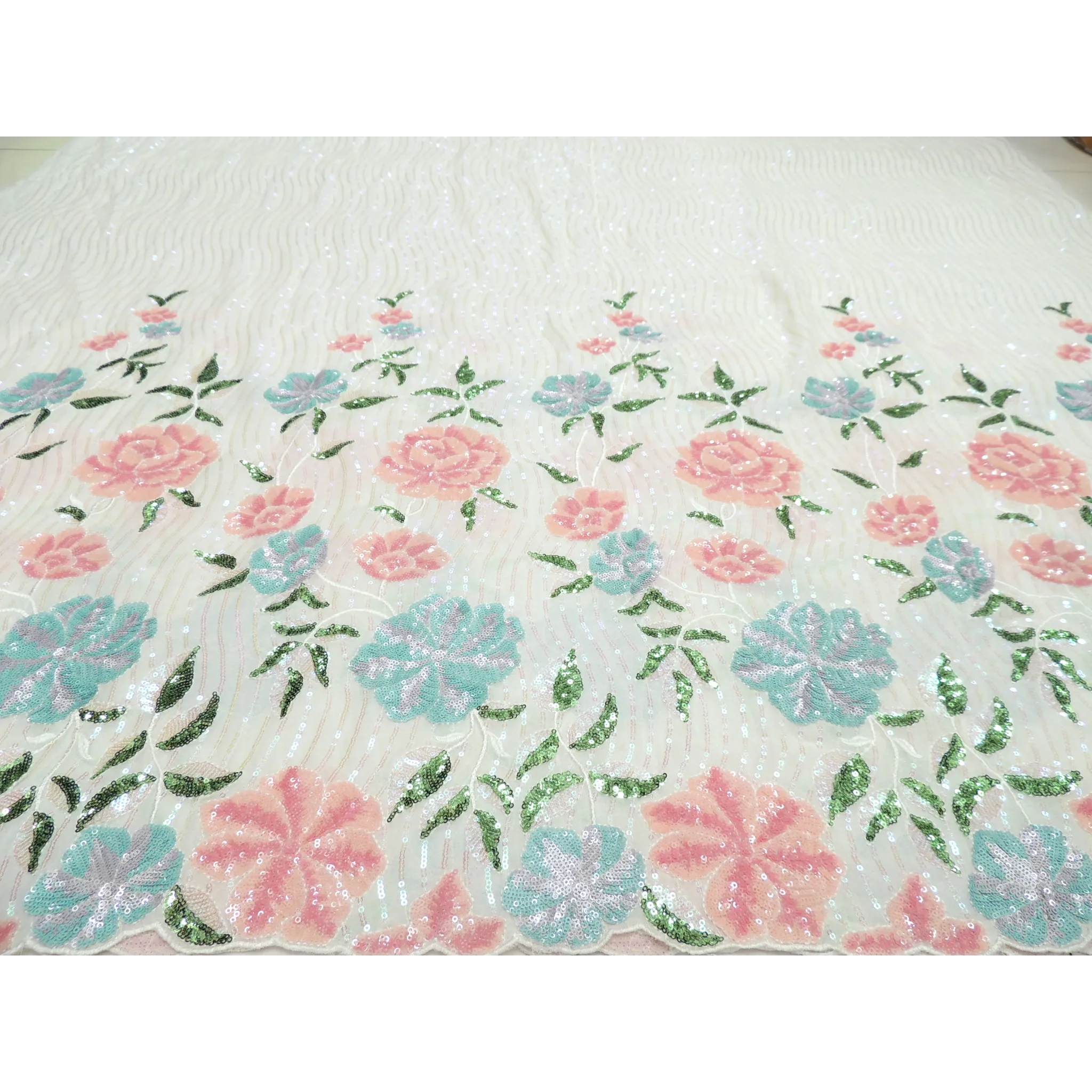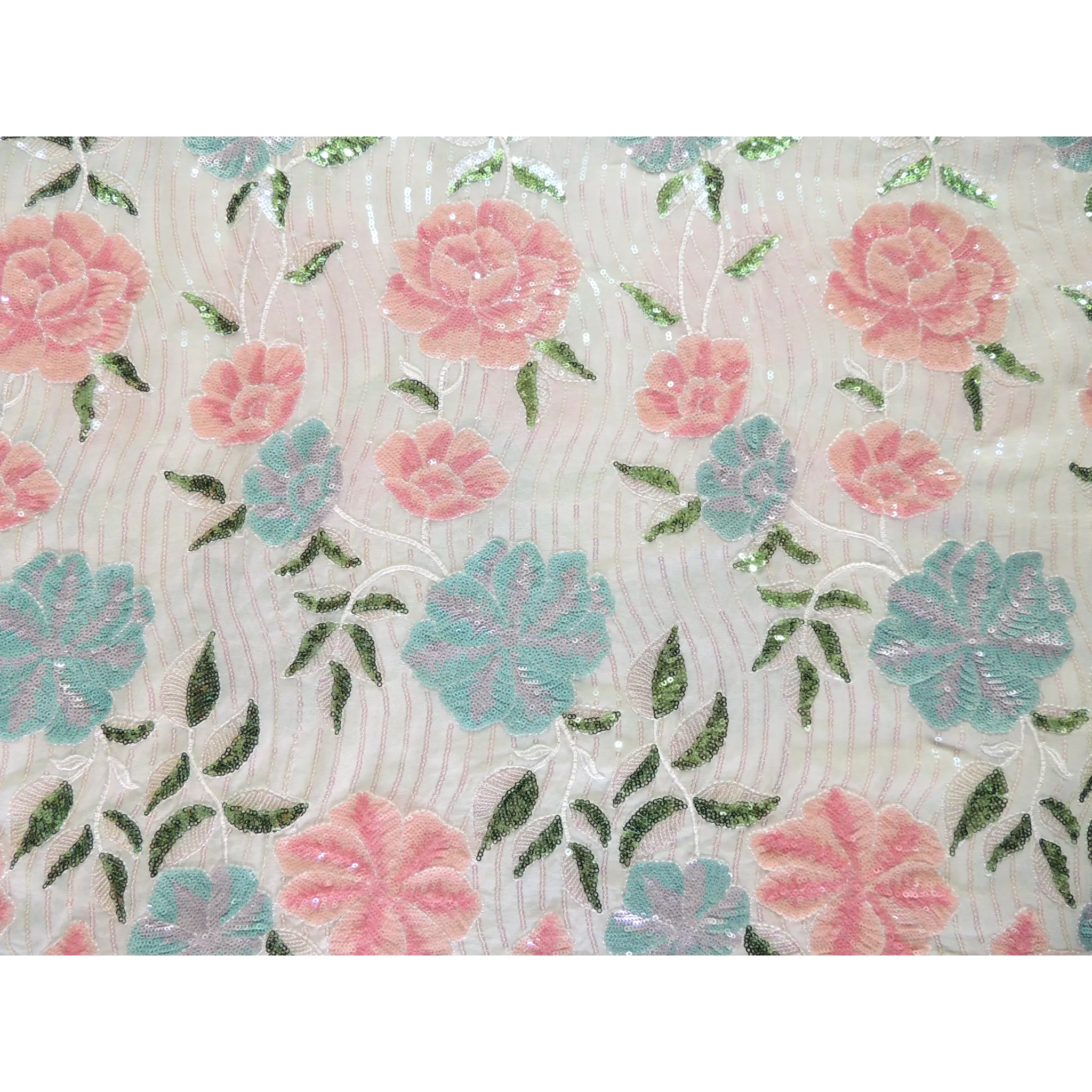 Add an ethereal touch to your creations with this beautiful floral rainbow sequins embroidery on white dyeable georgette fabric with cut work border. Its lightweight yet durable design showcases a stunning sequin embroidery pattern that sparkles in the light! Perfect for any special occasion.