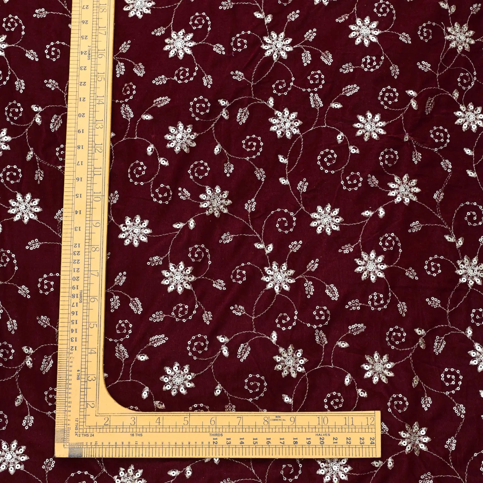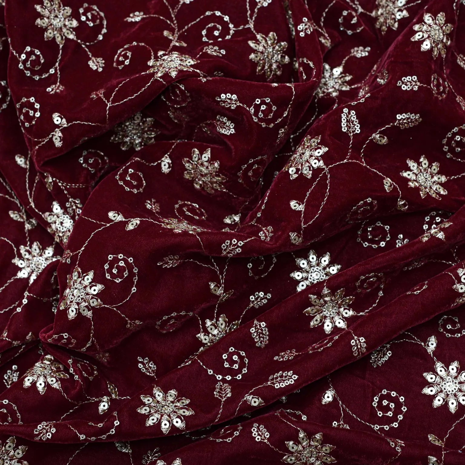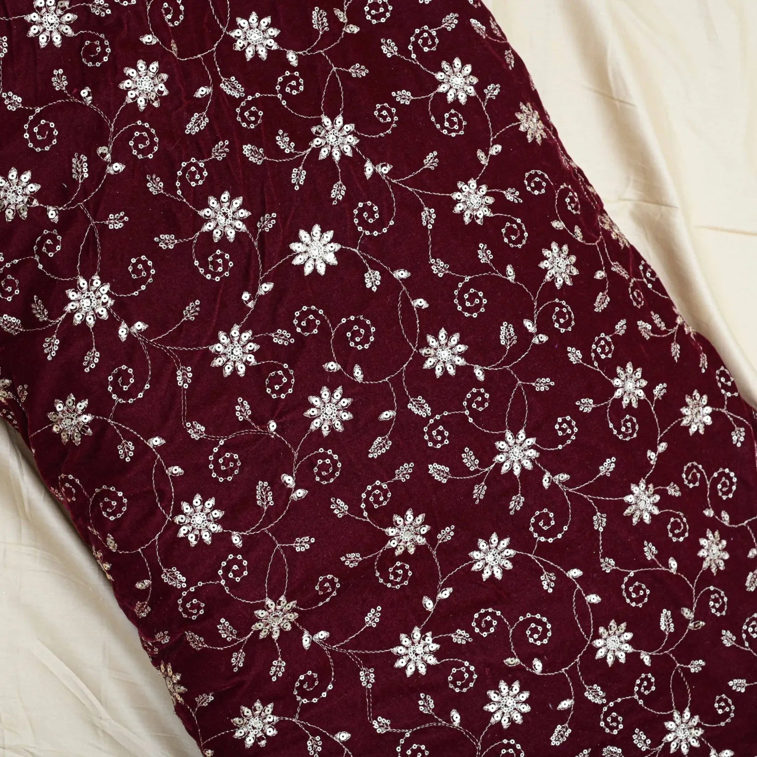 Feel timelessly elegant in this luxurious maroon velvet fabric embroidered with ornate golden jaal work all over. With a regal shade of blue, you'll feel like royalty in this stunning fabric. Give yourself a touch of glamor and sophistication!