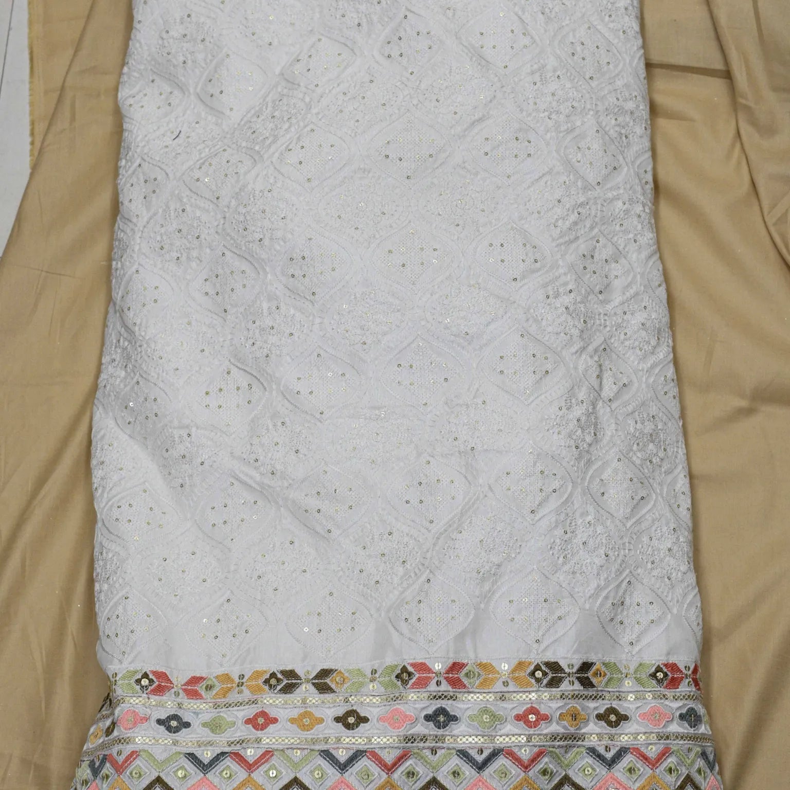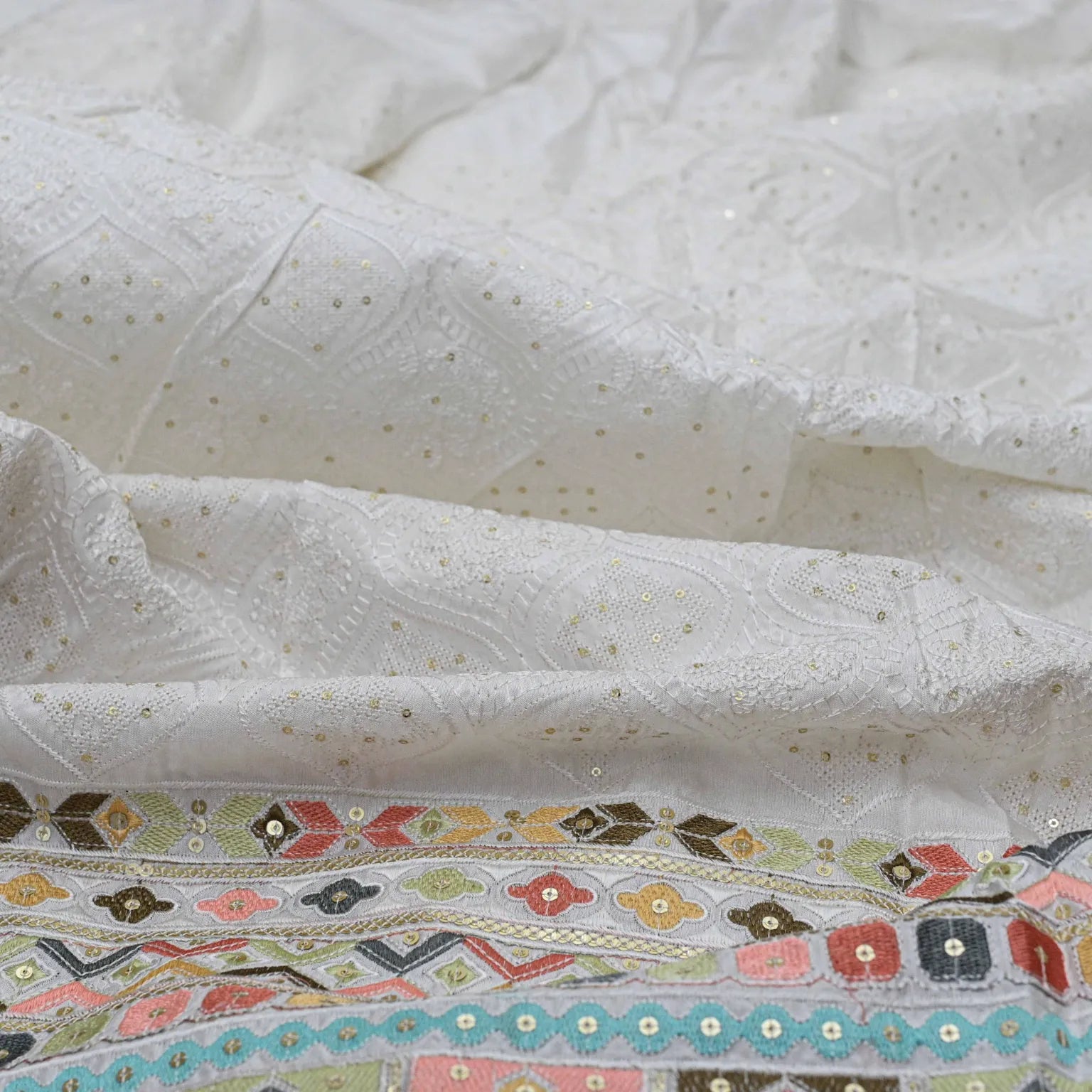 Experience the soft, luxurious feel of Russian Silk, delicately embroidered with a multi-colour border. With dyeable fabric, you can create the perfect colour to match any outfit or occasion. Add a special touch to your wardrobe with Thread Work Embroidery!
