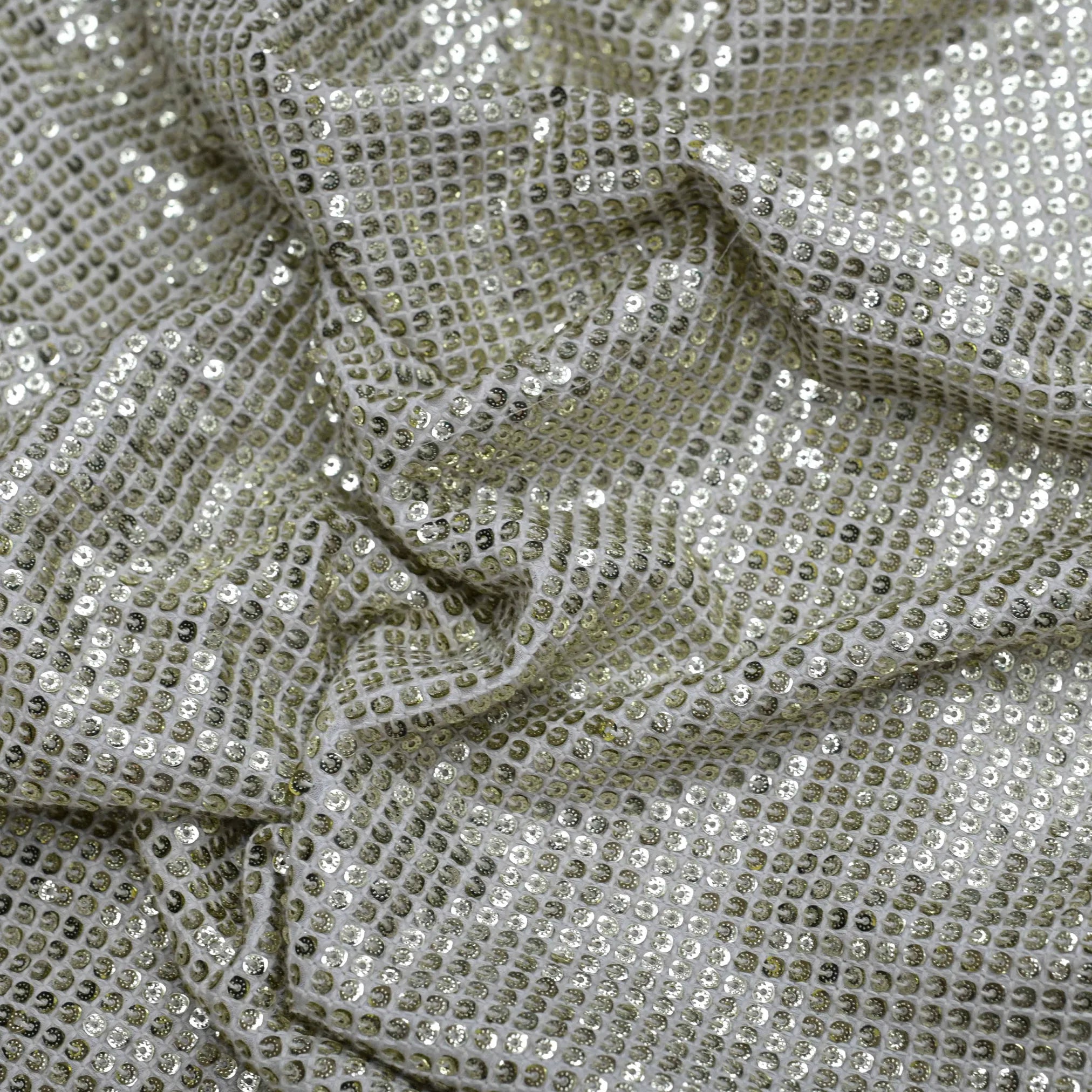 Dazzle with this unique fabric featuring all-over golden sequins and a dyeable georgette fabric. Create unique garments with a touch of sparkle that sets you apart from the crowd!