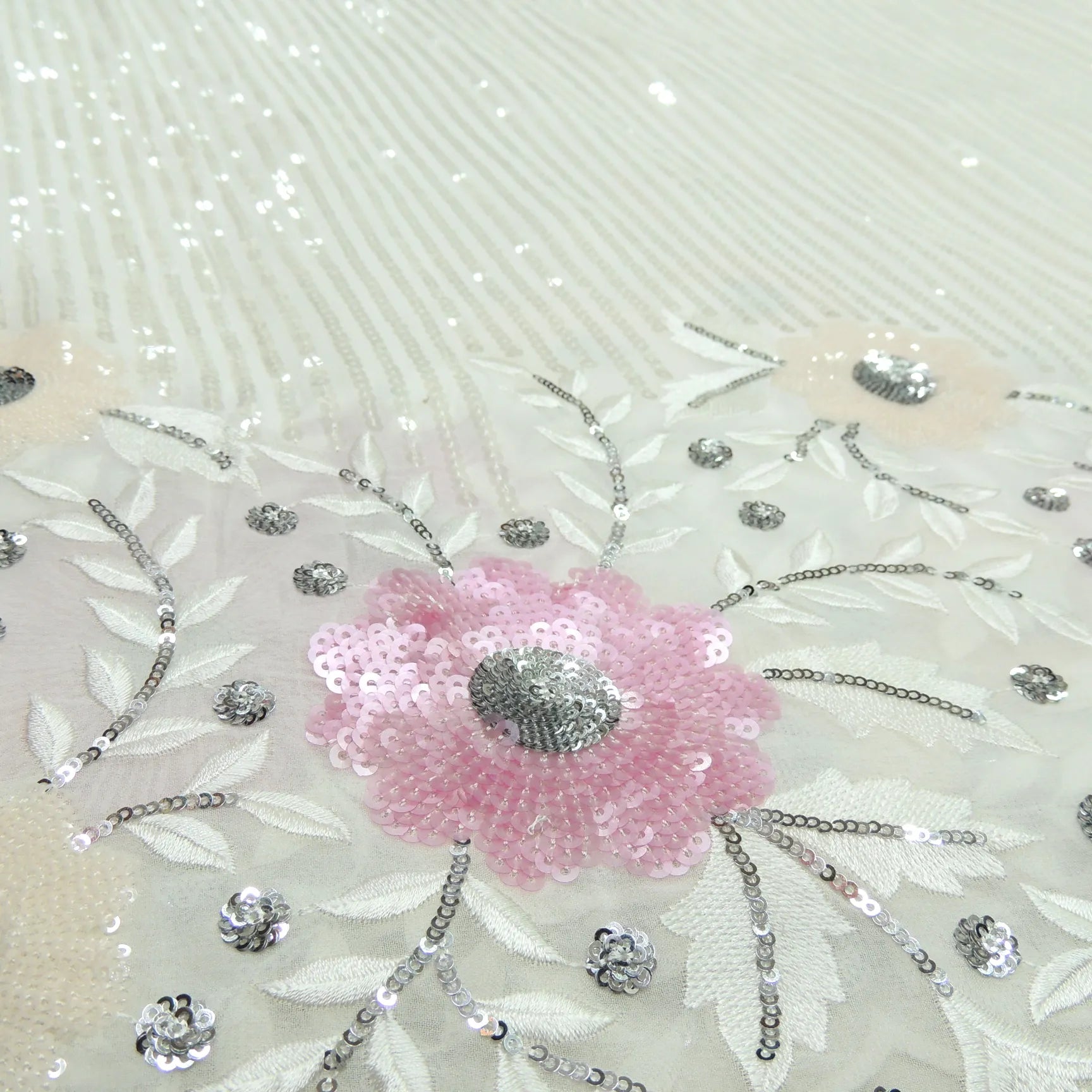 Unleash your creativity with this exquisite All Over Sequins Work Embroidery On White Dyeable Georgette Fabric With Floral Cut Work Border. Perfect for crafting beautiful designs that sparkle and shine, this fabric is sure to make your project stand out!