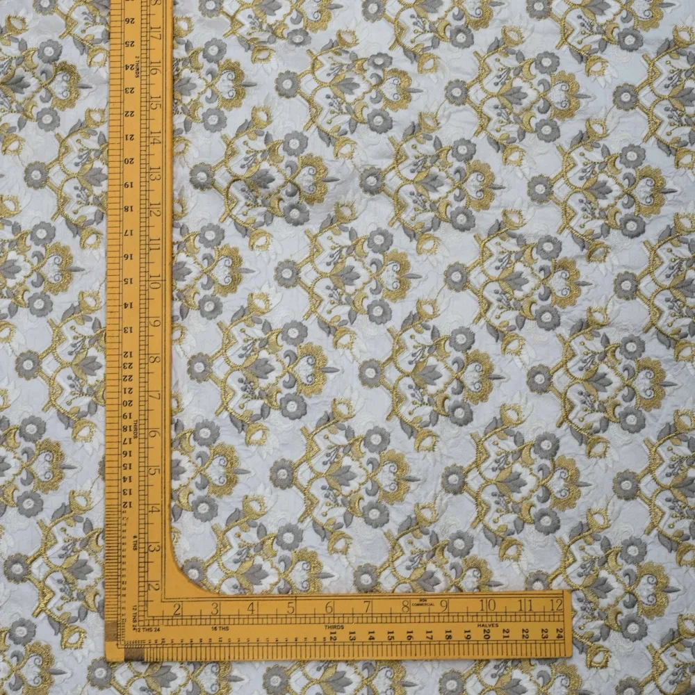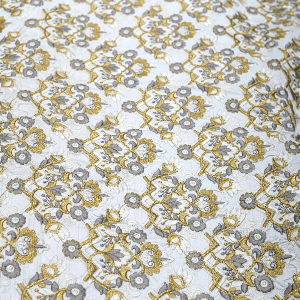 Discover this unique white dupion silk fabric featuring beautiful multi-coloured thread work embroidery and tikki designs! Perfect for creating a statement-making dress or top, this fabric is both elegant and eye-catching. Experience the exquisite feel and texture of the silk, and transform it to your des.