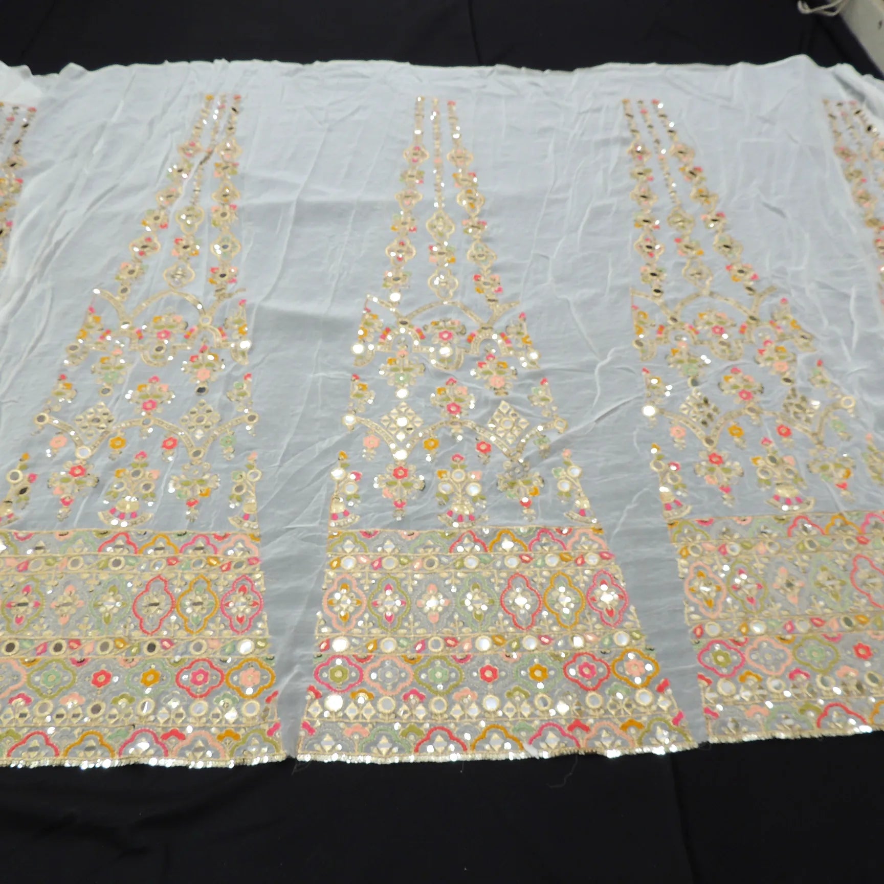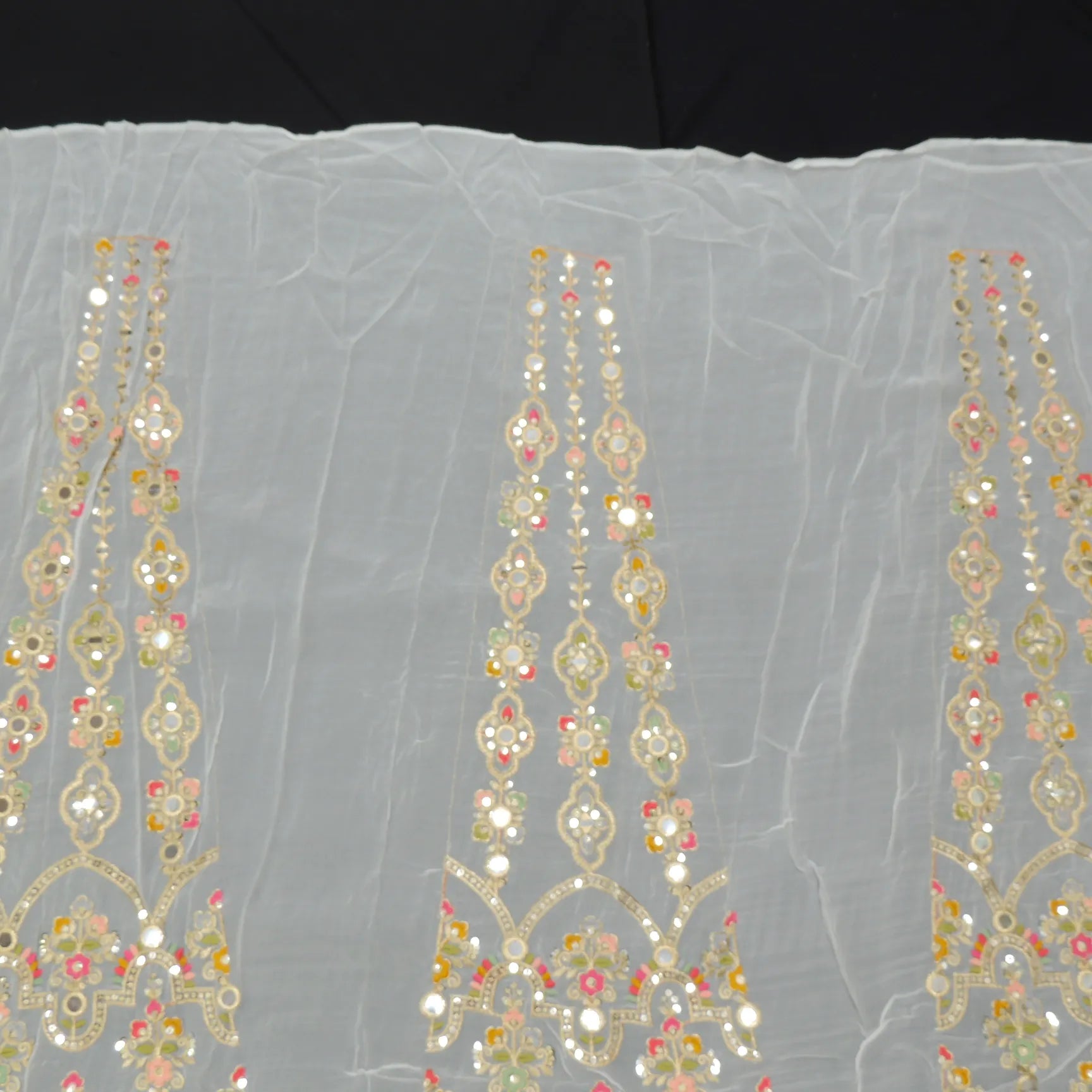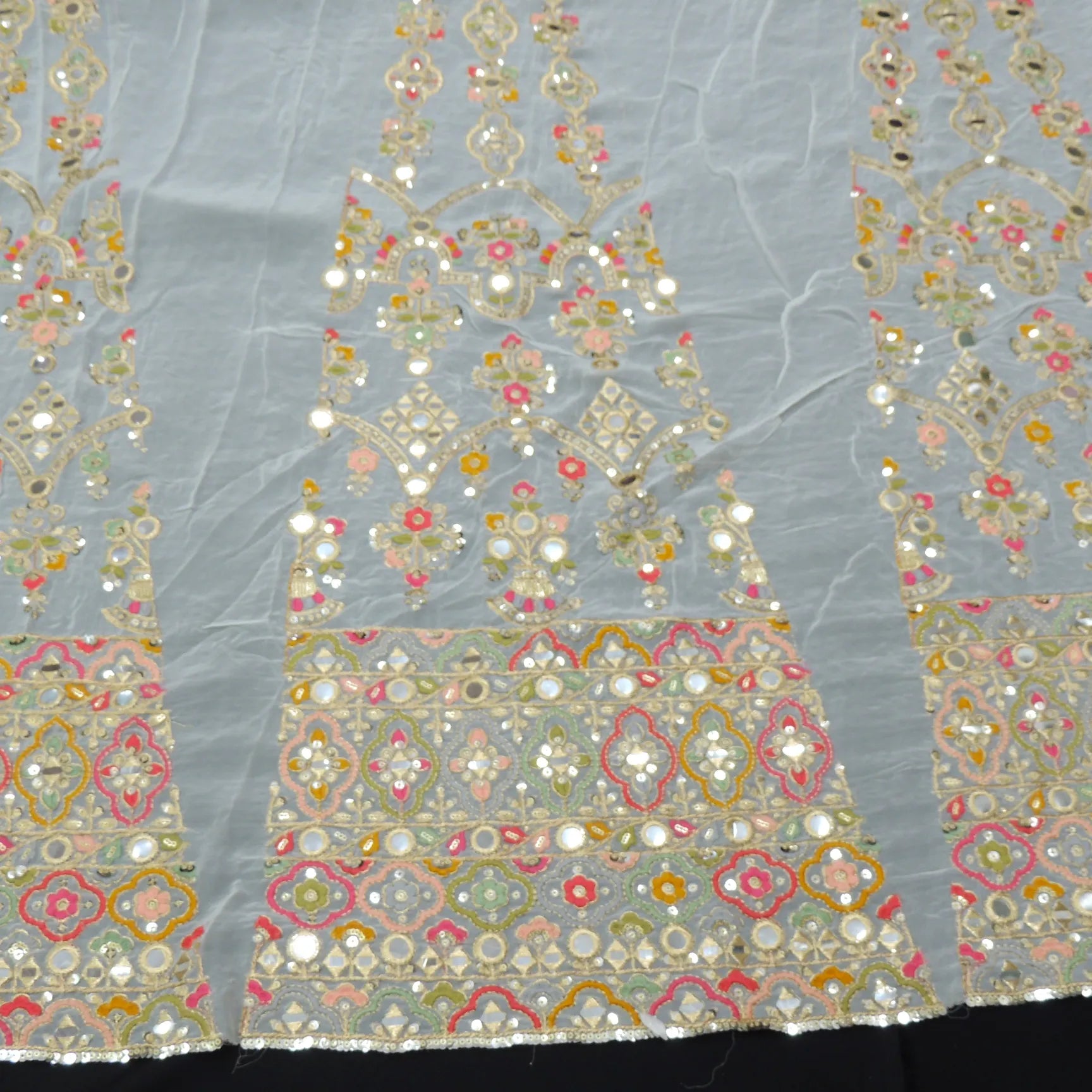 This mesmerizing Multi Color Mirror Work Kali On White Dyeable Georgette Fabric will have heads turning! Luxurious fabric makes it perfect for creating showstopping lehenga and chaniya choli. Guaranteed to make you stand out!