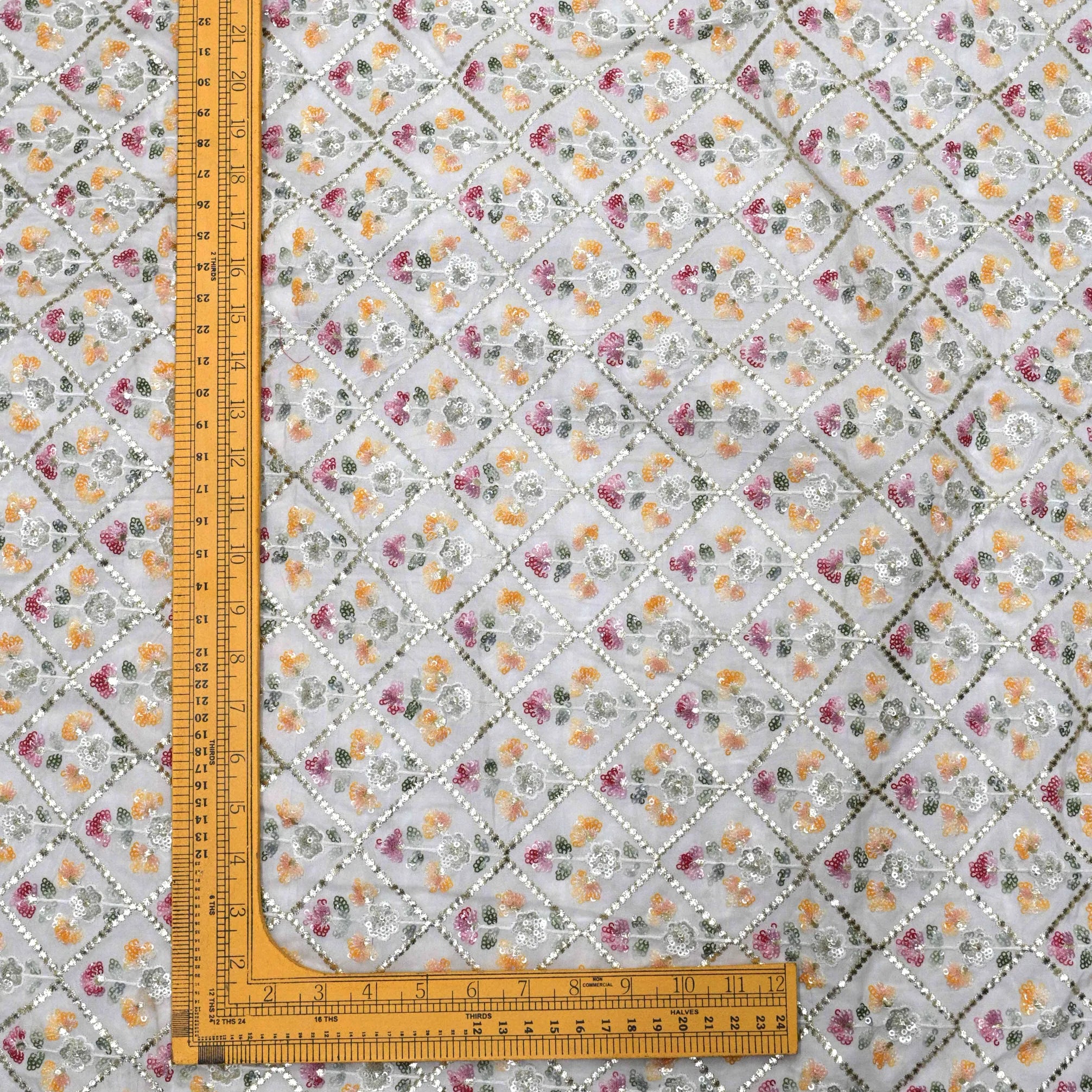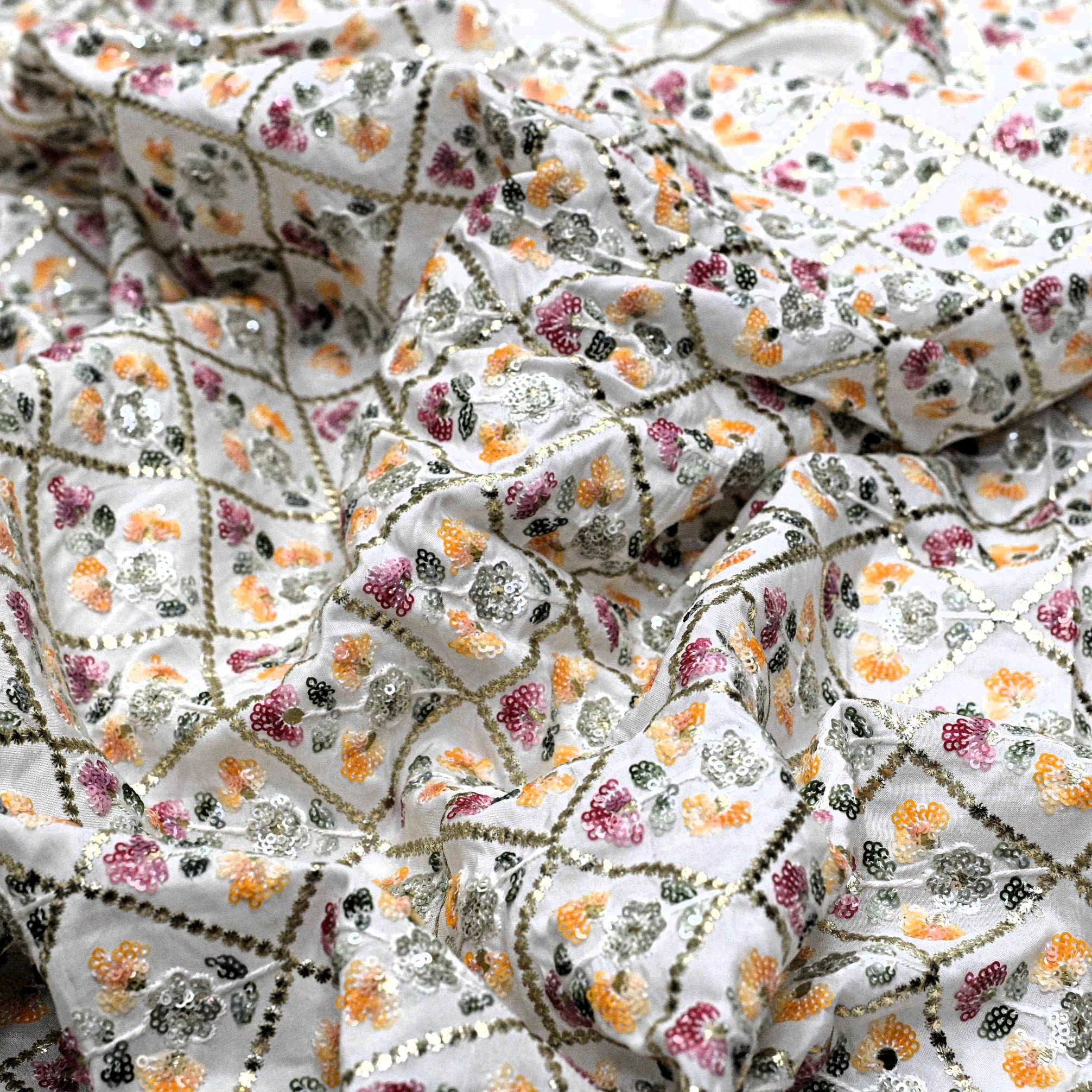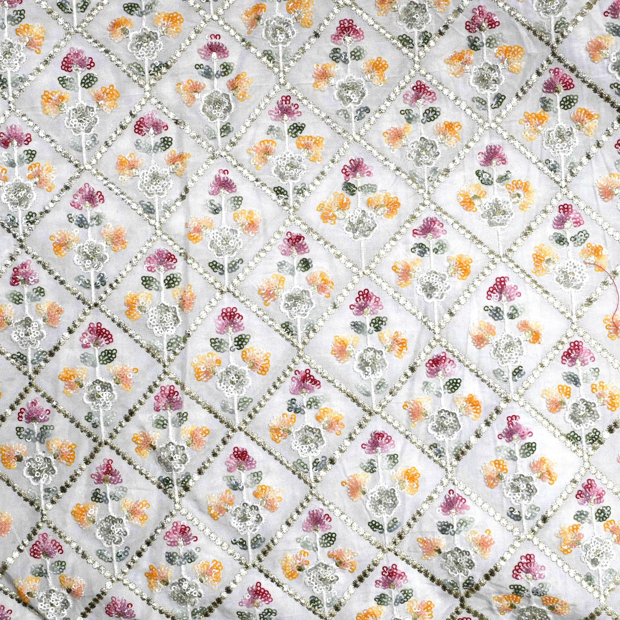 This exquisite Thread Work Embroidery On White Dyeable Upada Fabric is the perfect addition to your wardrobe. It features a modern multi-colour all-over floral checks embroidery design, creating a vibrant and colourful style. Dress it up, or dress it down, make this fabric your own!
