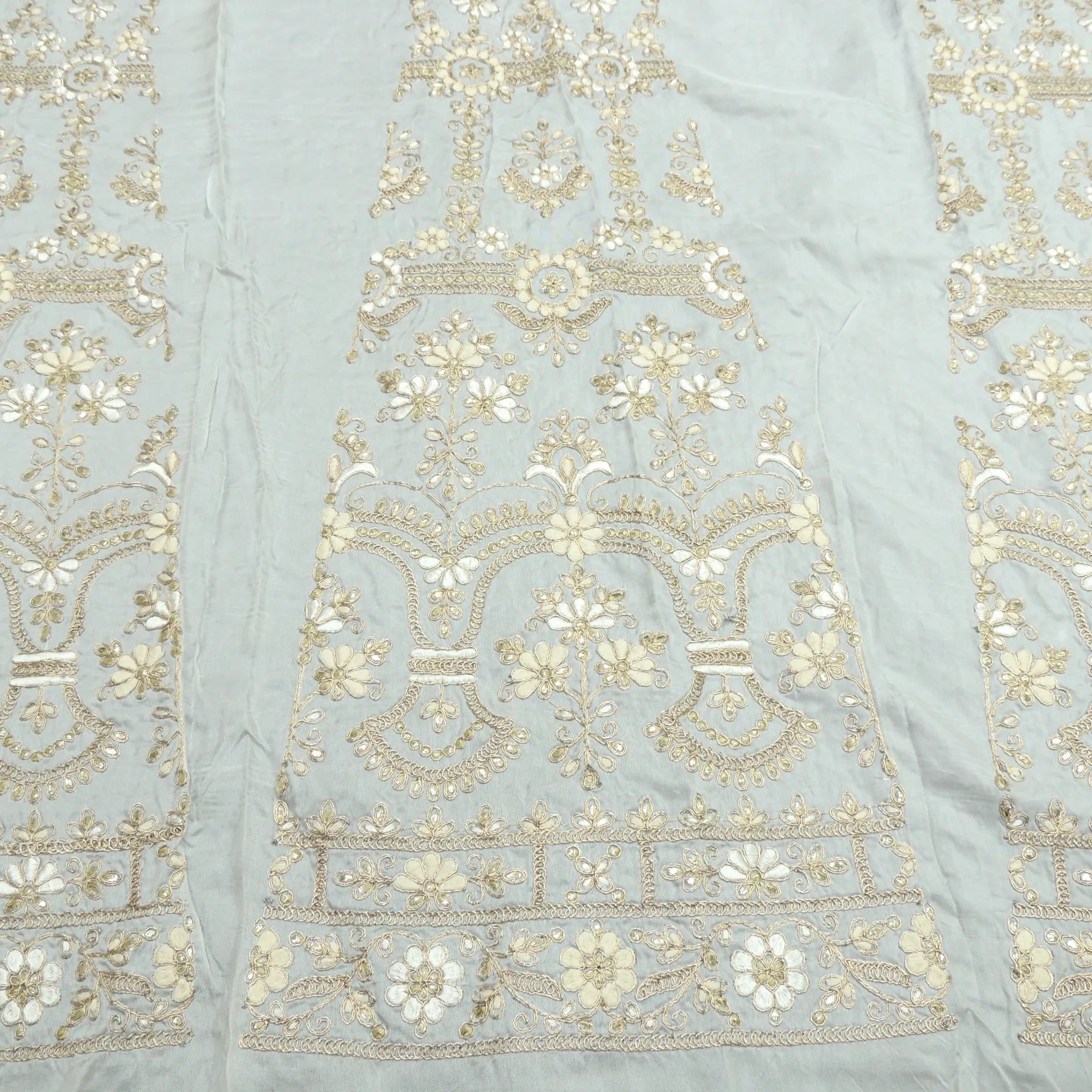 Unleash your creative side with this beautiful Zari Thread Work Kali On White Dyeable Russian Silk Fabric. Perfect for making your dream lehenga or chaniya choli, this fabric is both durable and easy to dye. Make something special with this unique and vibrant fabric!